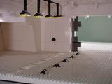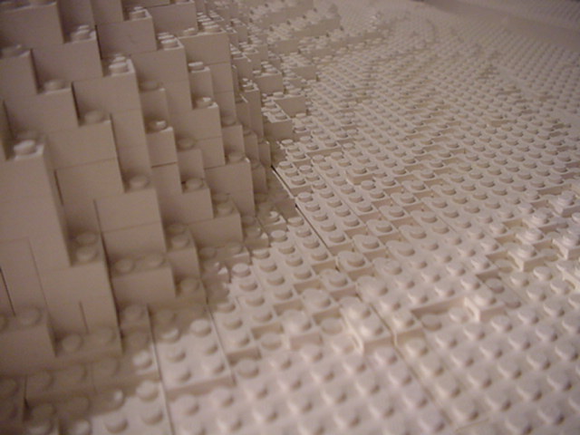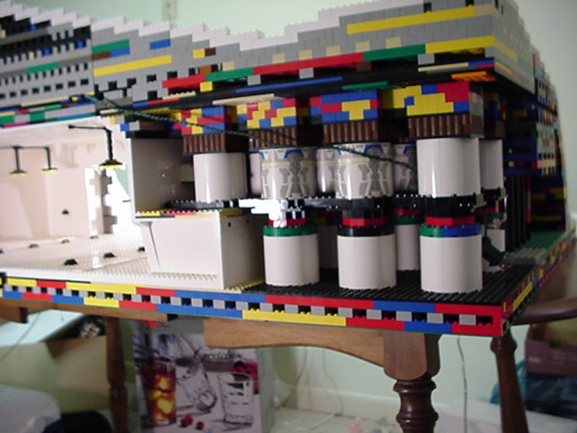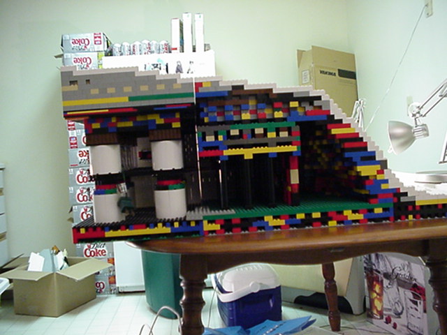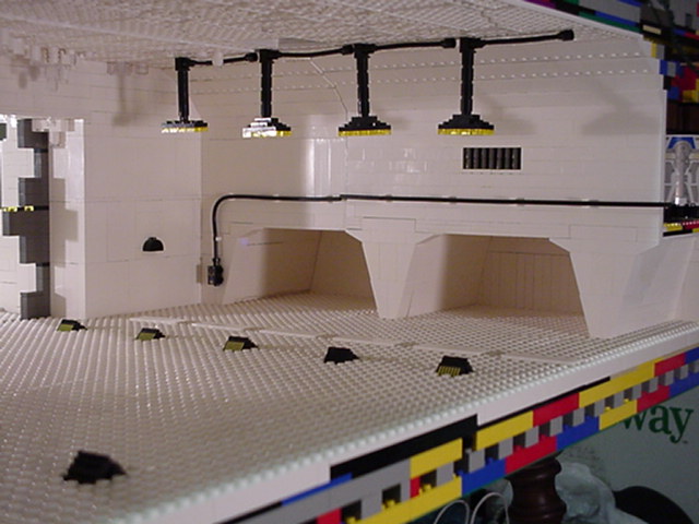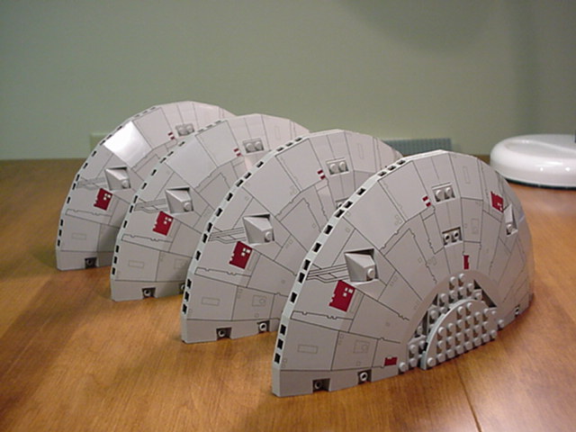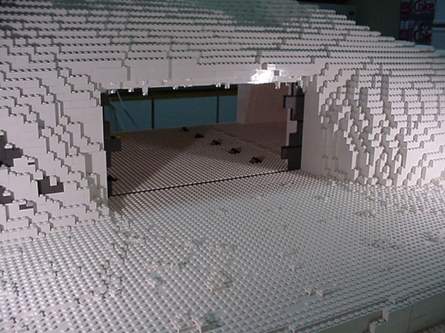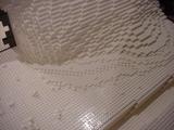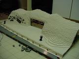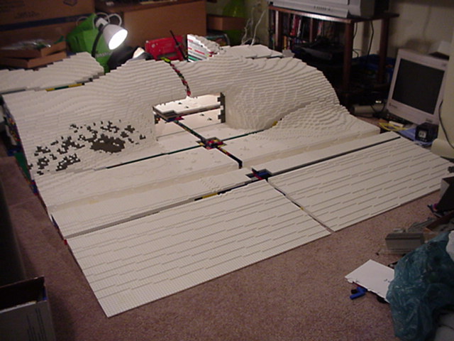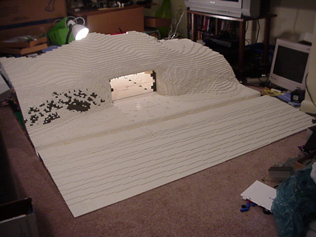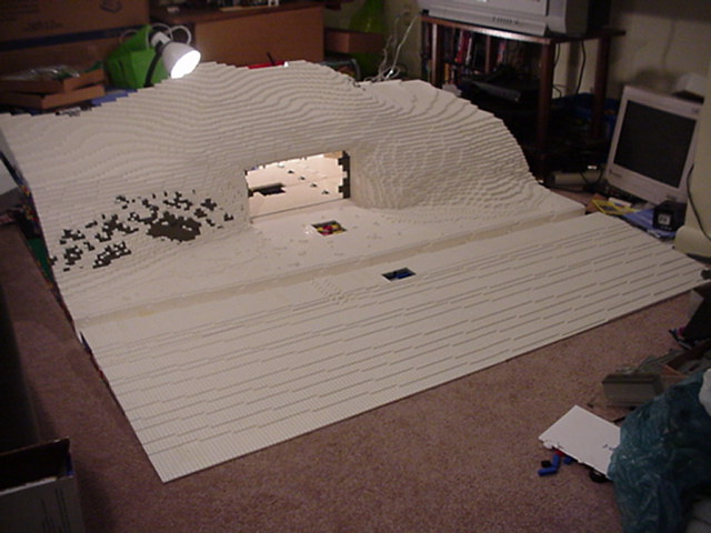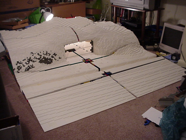 The base itself is made up of 9 sections, weighing in at 157 pounds and an estimated 24,000 bricks. The sections shown below measure about 5'0" x 4'7" (1.5m x 1.4m). In order to build it, I used the soundstage design plans for the hangar in The Art of The Empire Strickes Back. Without enough bricks to build the entire hangar, I built approximately the formost third of it, and also the trench and snow-mountain outside of it.