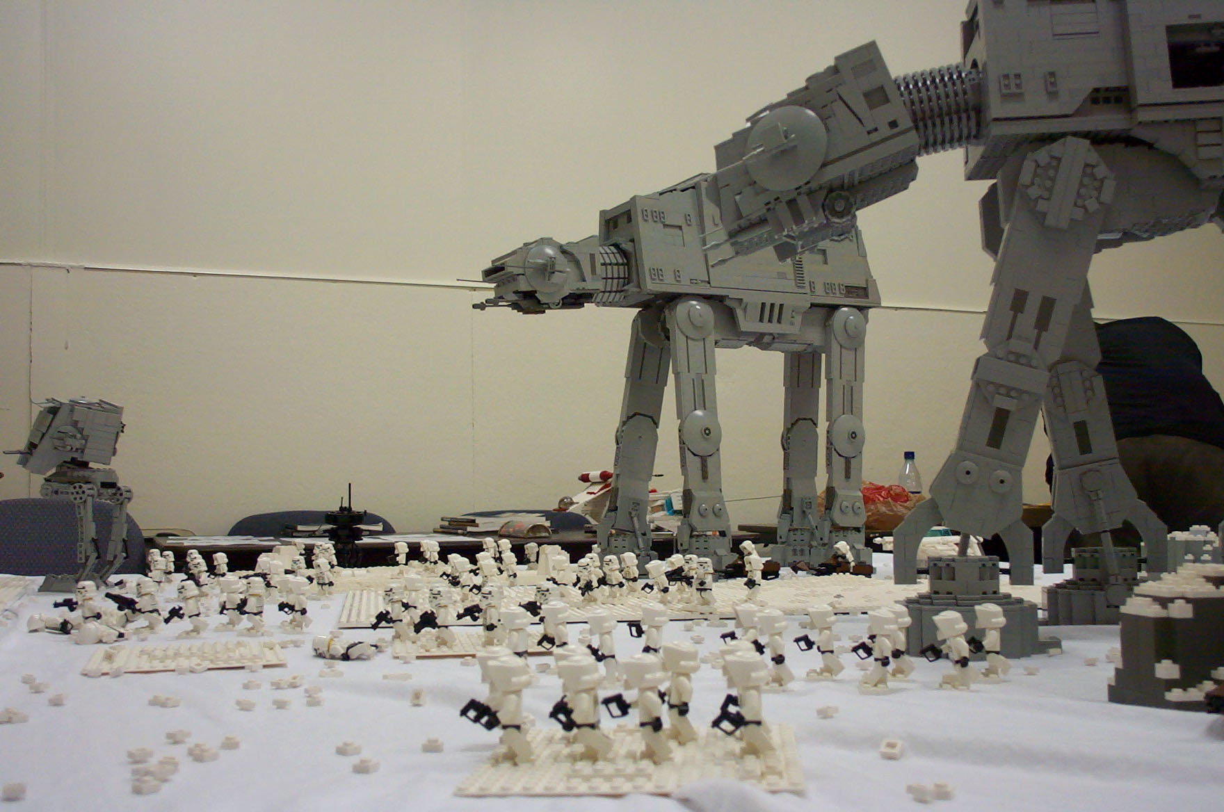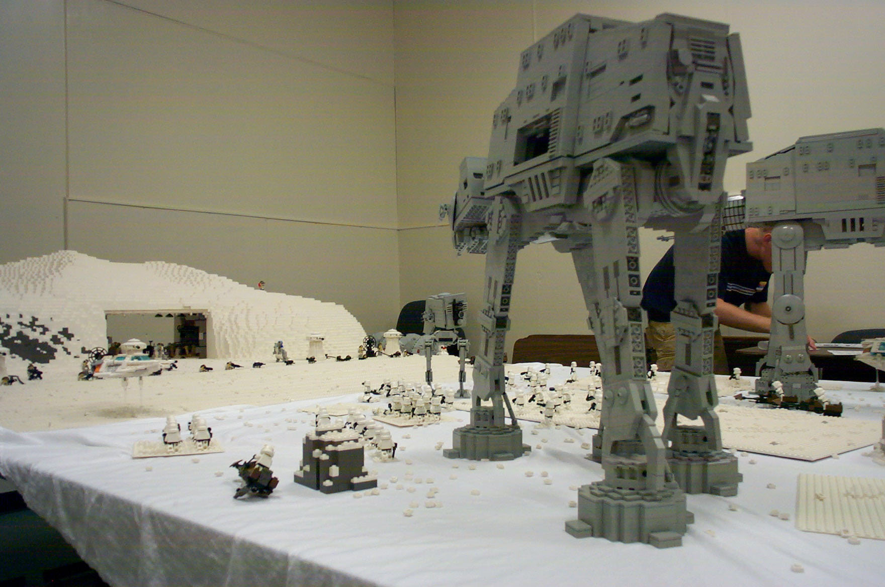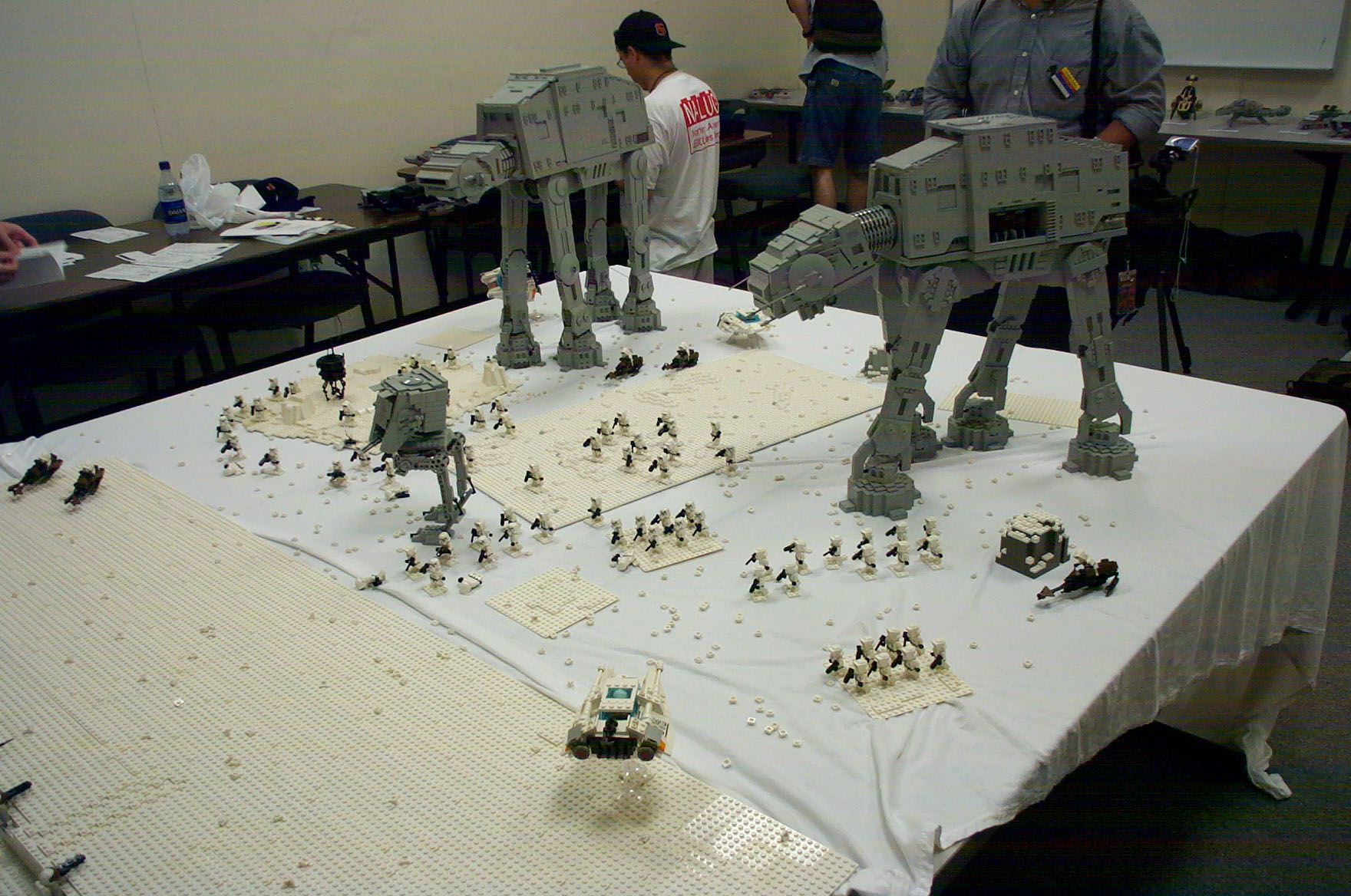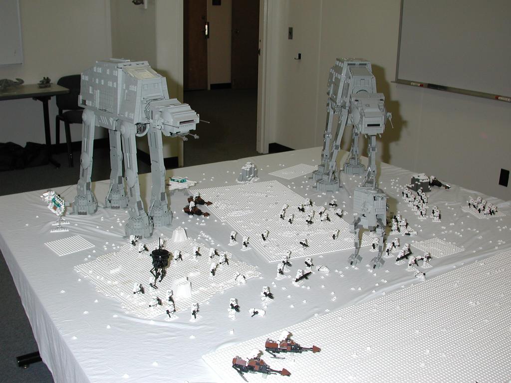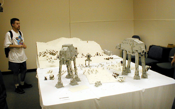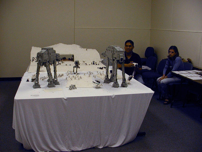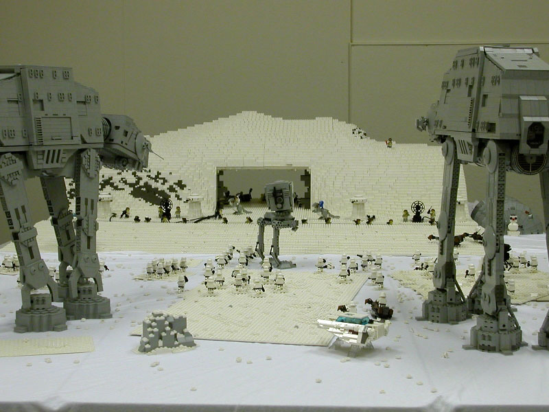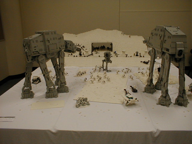 The Assault on Hoth Determined for my newest version of the AT-AT to go out in a "blaze of glory" before its dismantling, I began my secret plans to create a re-enactment of the battle on Hoth. But just 1 AT-AT would never do. So I enlisted the aid of Shaun Sullivan, who had an AT-AT of his own, and, as an added bonus, also had his own AT-ST. With this in mind, I set about constructing a version of the Rebel Base upon which to lay the scene, using up a whopping 24,000 bricks (about). Together with some other details, the project was completed (nearly) in time for BrickFest 2002, where it made its debut. Combined with the AT-AT's, vehicles, troops, and scenery, this made for a display consisting of roughly 40,000 bricks. However, dissapointed with my lack of good pictures from the event, I enlisted more help from several willing photographers who took pictures of the event, and collected over 150 images seen here. Special thanks go to Troy Cefaratti, Abe Friedman, Constantine Hannaher, Paul Hartzog, Michael Huffman, Jake McKee, Joe Meno, Shaun Sullivan, and Calum Tsang, who all let me use their images! (Note: some images have been modified in an attempt to remove discoloration, darkness, etc.)